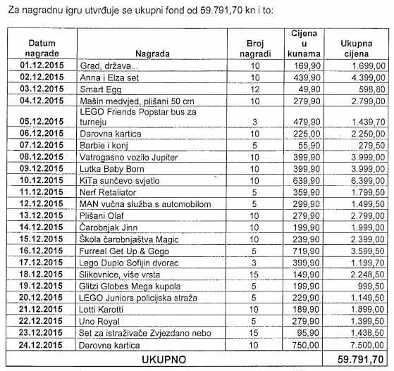 DOSADAŠNJI DOBITNICI NAGRADNE IGRE „ADVENTSKI KALENDAR 2015.“ su: