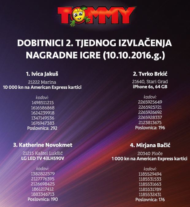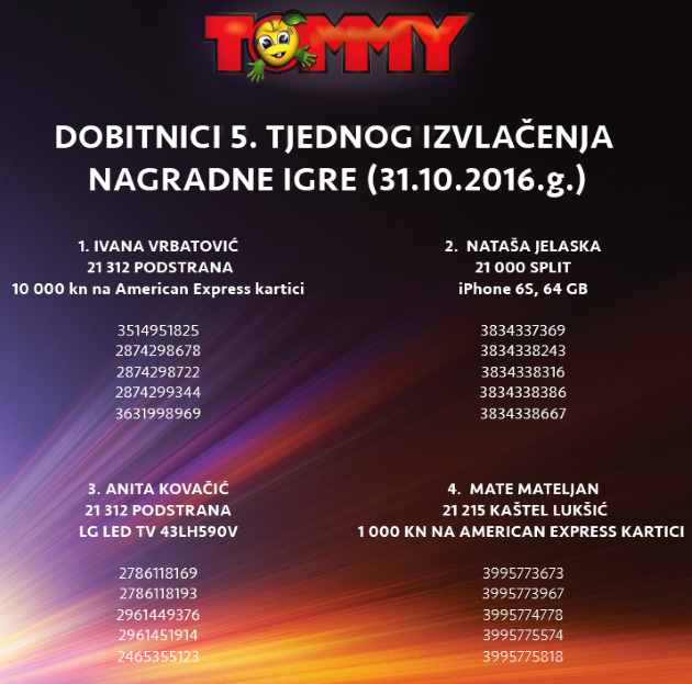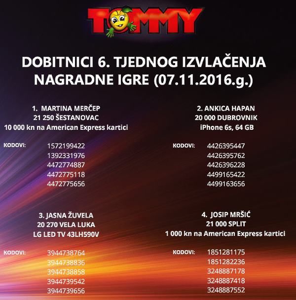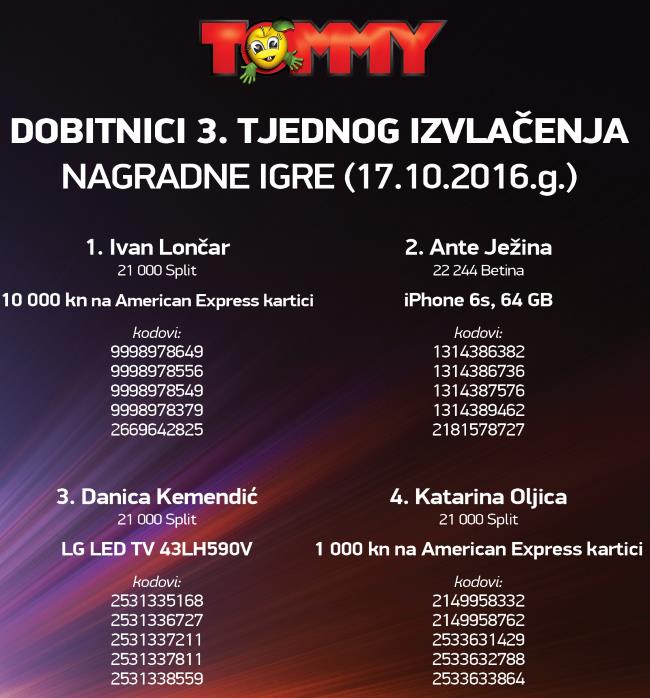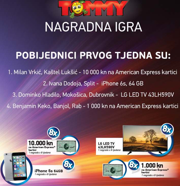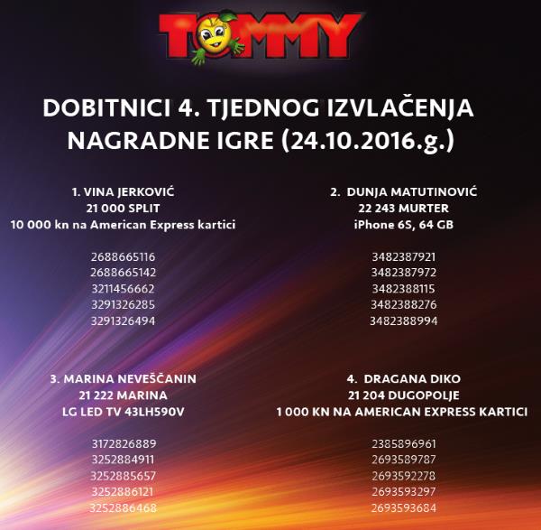 Za pretraživanje upišite naziv nagradne igre (najbolje samo naziv tvrtke ili proizvoda)Klikni i potraži nagradnu igruDobitnici Tommy nagradne igre 2016NaslovnicaDobitnici nagradne igreDobitnici Tommy nagradne igre 2016 TrgovinePopularnoPringles nagradna igra 2026: Počasti gejmera u sebi 30/03/2026KITKAT nagradna igra 2026: KitKat napravi pauzu kao prvak 29/03/2026Duracell igra 2026: Duracell Race 19/03/2026INA nagradna igra 2026: Kupi bilo što i osvoji putovanje iz... 03/03/2026Jar nagradna igra 2026: Pozdrav čistoći, zbogom masnoći! 27/02/2026 OglasiTrenutno popularnoPringles nagradna igra 2026: Počasti gejmera u sebiKITKAT nagradna igra 2026: KitKat napravi pauzu kao prvakDuracell igra 2026: Duracell RaceINA nagradna igra 2026: Kupi bilo što i osvoji putovanje iz snovaJar nagradna igra 2026: Pozdrav čistoći, zbogom masnoći!FacebookWhatsAppEmailViberTwitterLinkedin Klikni i pošalji komentar ili pitanje Dodaj podsjetnik u kalendar Aktivne nagradne igreKalendar nagradnih igaraSve aktivne nagradne na jednom mjestu.Pogledaj popis Pravila možete pronaći na stranici Tommy nagradna igra 2016Dosadašnji dobitnici su: FacebookWhatsAppEmailViberTwitterLinkedin Najnovije nagradne igreUSKORO ZAVRŠAVA! Old Spice, Lasta, Nestle, Pringles, Duracell, Jar,…Podravka: Roštiljski blockbusterPlodine nagradna igra 2026: Grill TimDr. Oetker slatki nagradni natječajHell nagradna igra 2026: WIN with HELL – 20. godina za...Coca-Cola nagradna igra 2026: Zgrabi Coca-Colu i osvoji sjajne nogometne nagrade!Lidl nagradna igra: Svježa energija za pobjednički golPBZ nagradna igra: Uz PBZ Visa otputuj u Disneyland ParizPowerade nagradna igra: Powerade te nagrađuje!Za sve najnovije nagradne igre klikni OVDJE TagstommyNajnovije dodane nagradne igreUSKORO ZAVRŠAVA! Old Spice, Lasta, Nestle, Pringles, Duracell, Jar,… 26/04/2026 Podravka: Roštiljski blockbuster 25/04/2026 Plodine nagradna igra 2026: Grill Tim 24/04/2026 Dr. Oetker slatki nagradni natječaj 23/04/2026 Hell nagradna igra 2026: WIN with HELL – 20. godina za 60.000 eur 20/04/2026 Coca-Cola nagradna igra 2026: Zgrabi Coca-Colu i osvoji sjajne nogometne nagrade! 19/04/2026 Lidl nagradna igra: Svježa energija za pobjednički gol 19/04/2026 PBZ nagradna igra: Uz PBZ Visa otputuj u Disneyland Pariz 18/04/2026 Učitaj višeZa sve najnovije nagradne igre klikni OVDJE
