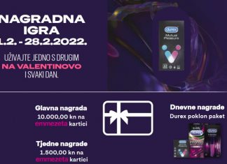 Trajanje:Durex nagradna igra traje od 01.02.2022. do 28.02.2022. na području Republike Hrvatske.Nagrade:1 x glavna nagrada: Emmezeta poklon bon u vrijednosti 10.000,00 kuna4 x tjedne nagrade: Emmezeta poklon bon pojedinačne vrijednosti je 1.500,00 kuna28 x dnevna nagrada: Durex poklon paket,...