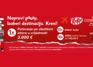 Trajanje:Nestle nagradna igra traje od 13.10.2025. do 30.11.2025. godine.Nagrade:1 x Kupon za PUTOVANJE PO VLASTITOM IZBORU u vrijednosti do 3.000,00 € (PDV uključen) u aranžmanu putničke agencije GLOBTOUR EVENT d.o.o.15x jedne Kitkat kofer, pojedinačne vrijednosti 48,19 €10 x jedna (1) SPAR poklon...