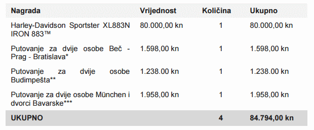 Nagradni fond uključuje:
