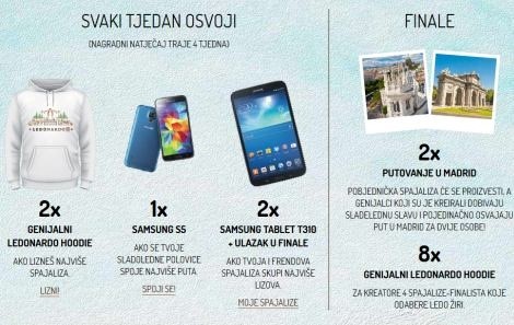 Ledo će nagraditi i najaktivnije natjecatelje. Mobitel Samsung S5, Samsung tablet T310 iLedonardo hoody majice osvojit će oni koji ponude najviše lizova, najviše polovica ili najaktivije sudjeluju u spajanju.