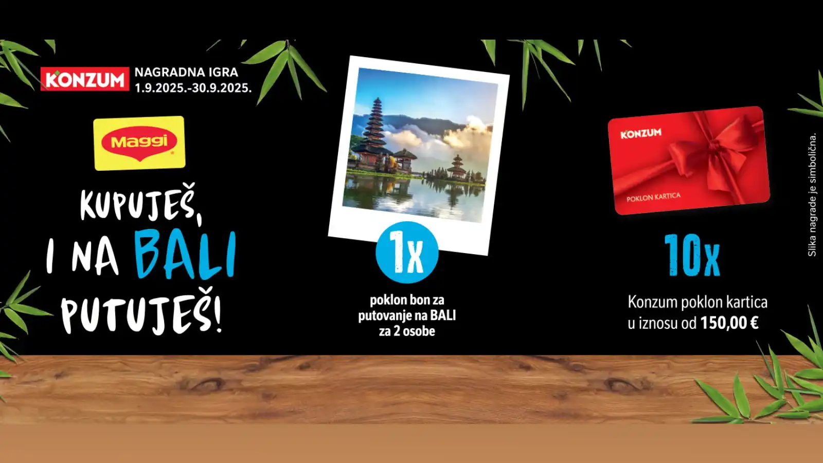 Prvo će se izvući 1 dobitnik nagrade poklon bon- putovanje na Bali za 2 osobe u vrijednosti od 4.500€, a nakon toga će se izvući deset dobitnika koji će dobiti svaki po jednu Konzum