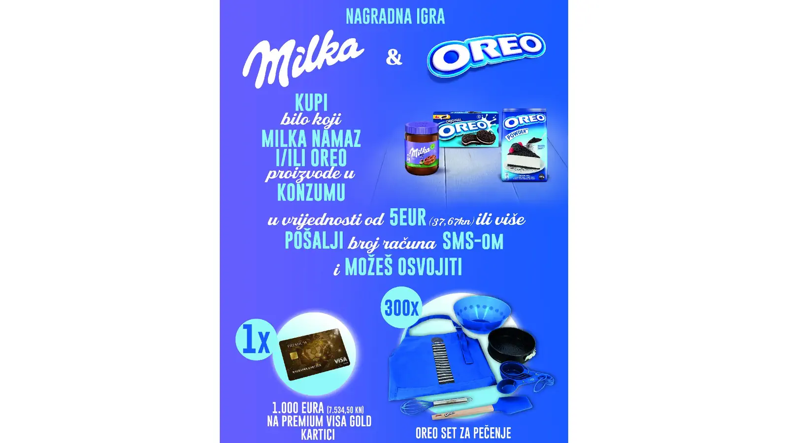 - U periodu od 02.11.2023. u 00:00 do 30.11.2023. godine u 23:59 sati u bilo kojem KONZUM prodajnom mjestu na teritoriju Republike Hrvatske, ostvare kupovinu “Milka Spread” i/ili “Oreo*” proizvoda u minimalnoj vrijednosti od 5,00 € (37,67 kn) u jednoj kupovini na jednom računu.