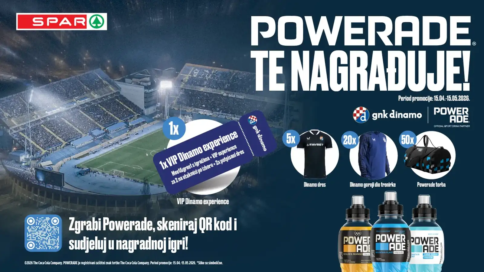 - U razdoblju od 15. travnja 2026. od 12:00:00 sati do 15. svibnja 2026. do 12:00:00 sati u trgovinama SPAR i INTERSPAR na području Republike Hrvatske kupiti najmanje jedan Powerade proizvod naveen u pravilima.