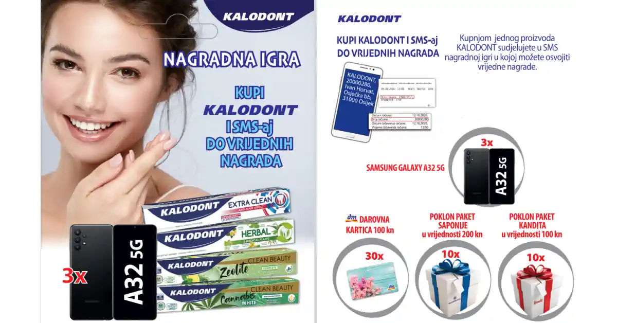 - Nakon kupovine proizvoda pošalju SMS poruku sljedećeg sadržaja na broj 60141: Ključnu riječ KALODONT, broj računa, ime i prezime, adresa i grad (npr. KALODONT 1234/123/1, Ivan Horvat, Osječka bb, 31000 Osijek). Cijena SMS-a je 2,40 kn (PDV uključen).