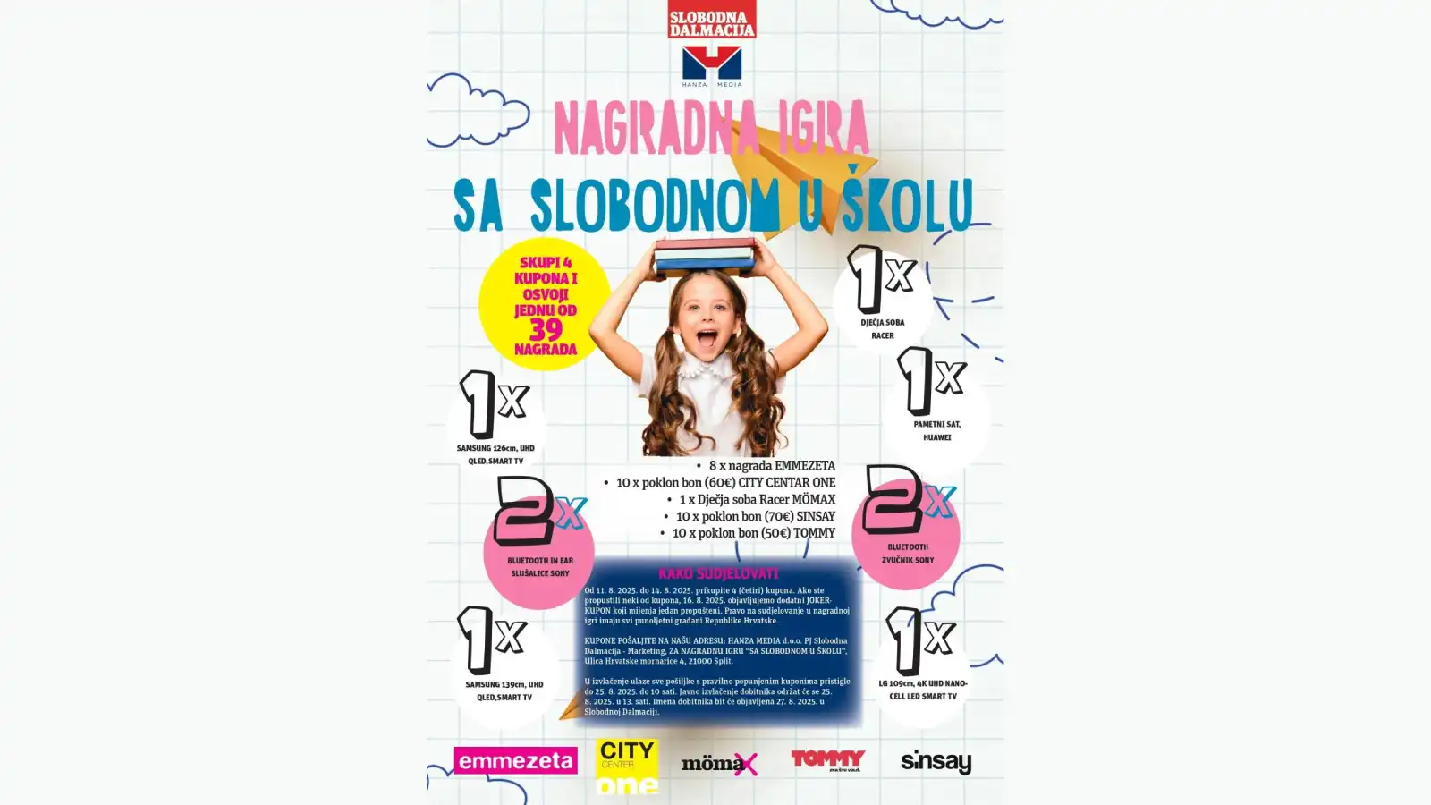 - HANZA MEDIA d.o.o. PJ Slobodna Dalmacija – Marketing, ZA NAGRADNU IGRU “SA SLOBODNOM U ŠKOLU”,Ulica Hrvatske mornarice 4, 21000 Split