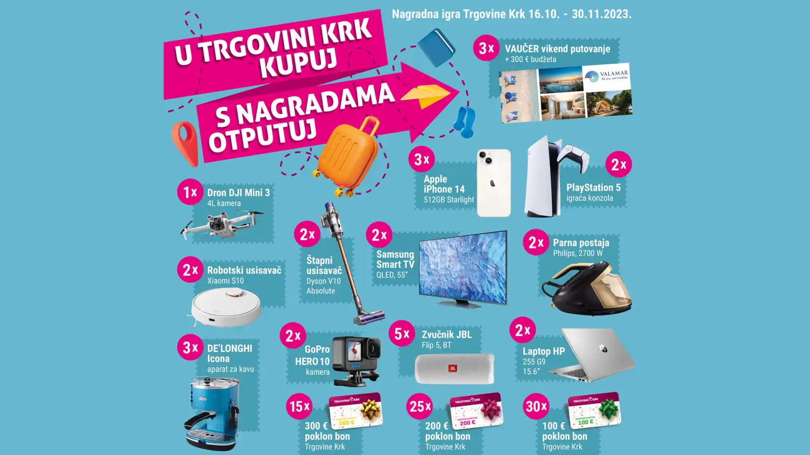 Nagradna igra Trgovina Krk traje od 16.10.2023. do 30.11.2023. u svim maloprodajnim podavaonice prehrane Trgovine Krk na području RH.